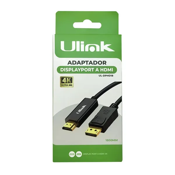 El adaptador  DisplayPort a HDMI 4K  modelo UL-DPHD18, te permite conectar fácilmente tu computadora de escritorio o portátil, a un monitor HDMI compatible con DisplayPort 1.2 y HDMI 4K @ 30 Hz. Admite resolución de vídeo Ultra HD (4K) y audio digital envolvente de hasta 7.1 canales. Con soporte para resoluciones de hasta Ultra HD (4K), garantiza una calidad de imagen excepcional, cuatro veces superior a la de 1080p. Fácil de instalar, no requiere software adicional y su diseño compacto y ligero maximiza la portabilidad.