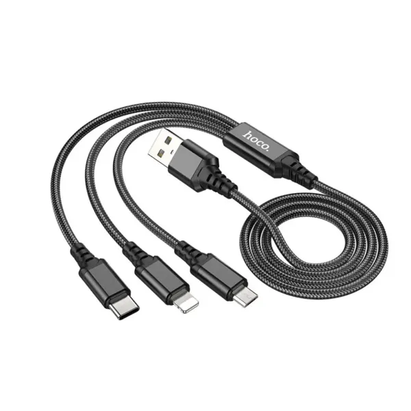 El Cable de Carga y Datos 3 en 1 Hoco X76 1 metro (2.0A) es una solución versátil para quienes utilizan distintos tipos de dispositivos. Incorpora tres conectores integrados: Lightning, Micro USB y USB Tipo C, permitiendo cargar múltiples equipos con un solo cable.