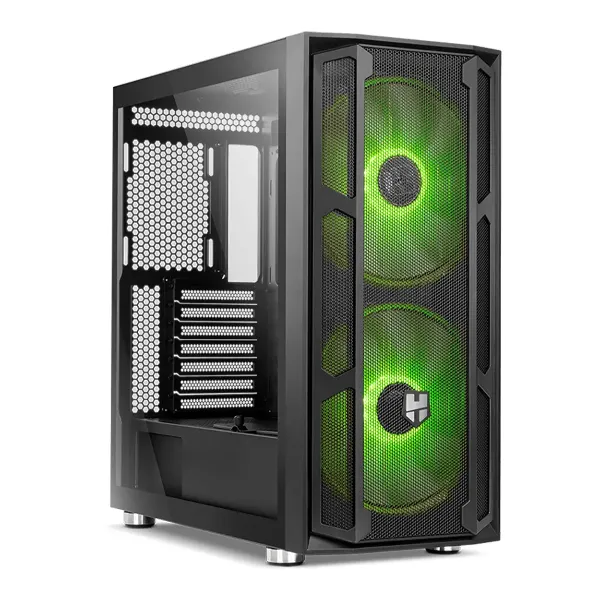 El diseño interno favorece la circulación de aire caliente hacia el exterior y permite la instalación de ventiladores adicionales o sistemas de refrigeración líquida según necesidad. Este gabinete se entrega sin fuente de poder (PSU no incluida), lo que ofrece flexibilidad para montar una fuente adecuada al rendimiento del equipo. Es compatible con placas madre ATX, micro-ATX e ITX y admite tarjetas gráficas de gran tamaño.