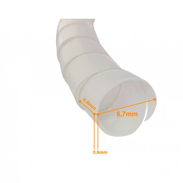 Las dimensiones indicadas (4,5 mm, 6,7 mm y 0,6 mm) corresponden a la gama de diámetros que puede abarcar o adaptarse al organizar distintos tipos de cables, mientras que la longitud de 17 metros proporciona cobertura amplia para gestionar varios tramos de tendido. Este tipo de organizador es especialmente útil cuando se trabaja con múltiples líneas de alimentación, datos y señalización en un mismo trayecto.