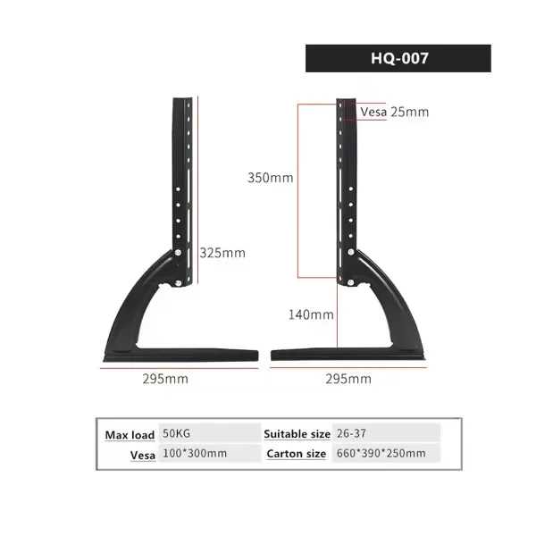 La Base para TV sobre Mesa HQ-007 es un soporte de sobremesa diseñado para televisores de 26” a 37”, brindando una solución práctica y estable para colocar tu pantalla sobre muebles, escritorios o repisas sin necesidad de fijarla a la pared.