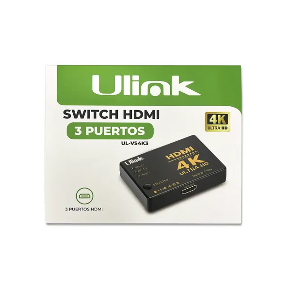 El video switch HDMI 1×3 UL-VS4K3 de U-Link es un conmutador que permite conectar una fuente HDMI a tres salidas diferentes, facilitando la distribución de una señal de video y audio hacia múltiples pantallas sin perder calidad. Ideal para entornos de oficina, aulas, señalización digital, centros de entretenimiento y presentaciones.